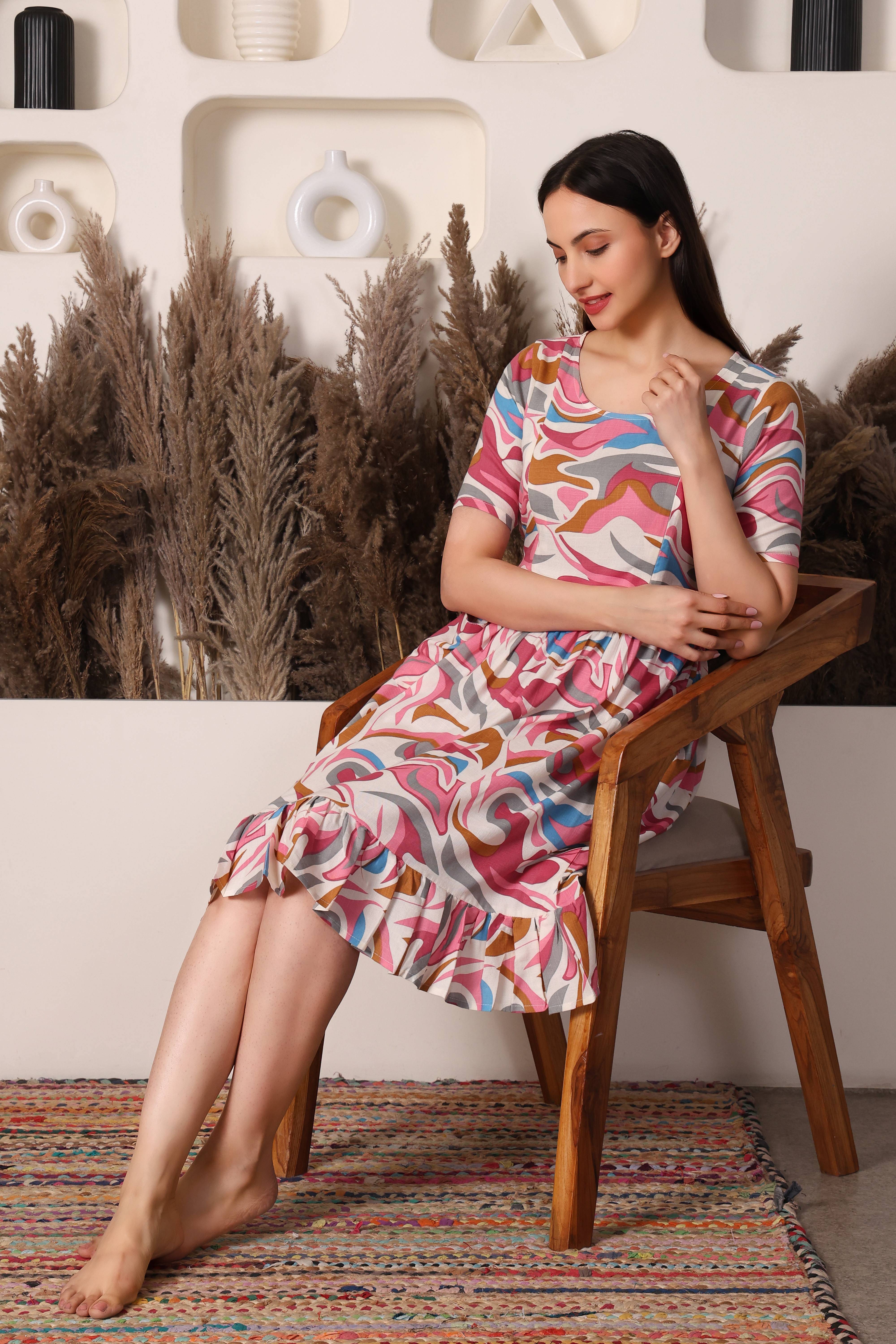 Embrace modern artistry with a dress designed to evolve with you. Featuring a striking multi-colored abstract print, this maternity piece is crafted from premium, breathable fabric that feels like a second skin. The thoughtful design balances a playful, ruffled aesthetic with the practical needs of a new mom, ensuring you stay confident and comfortable from pregnancy through nursing.