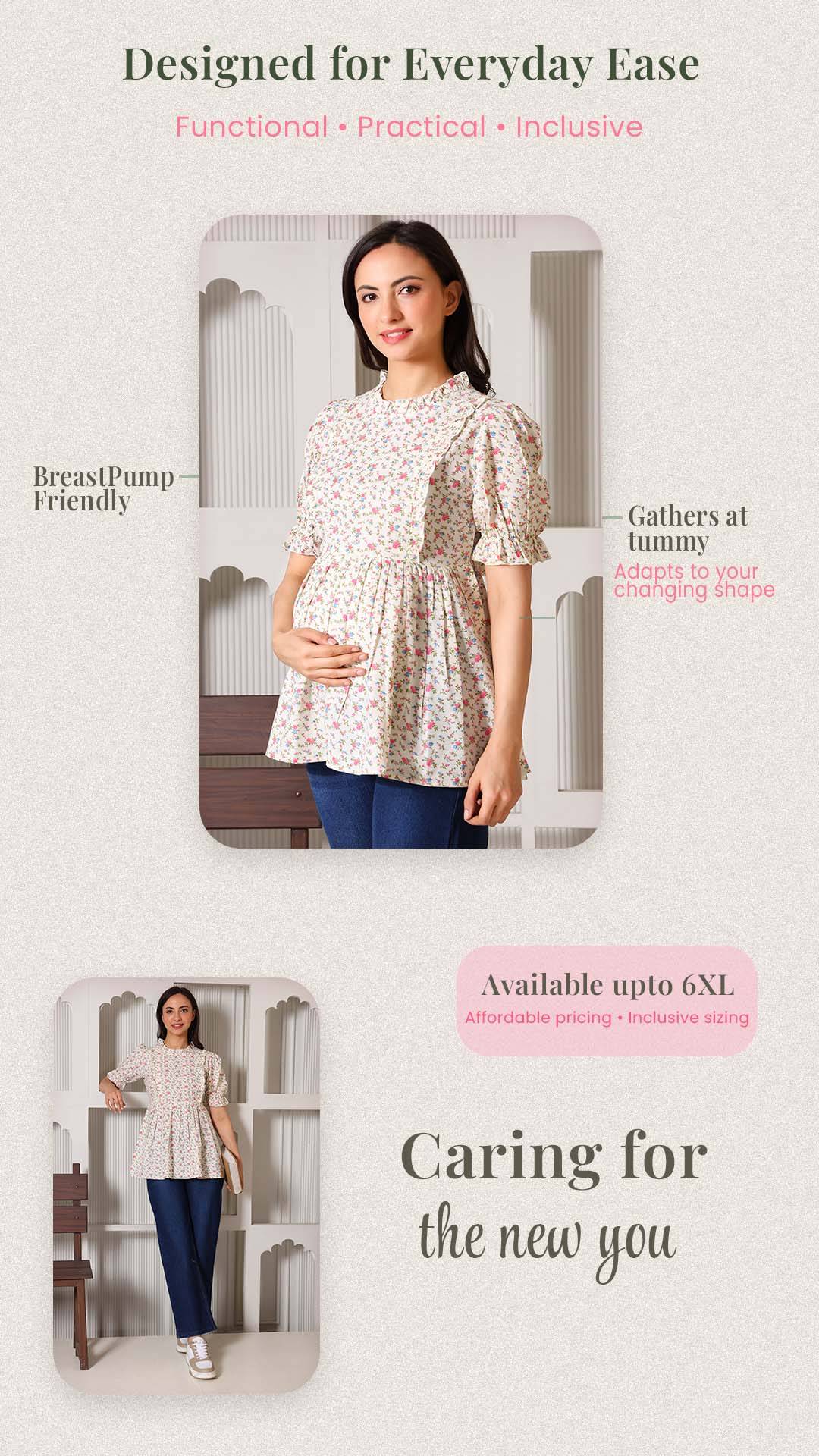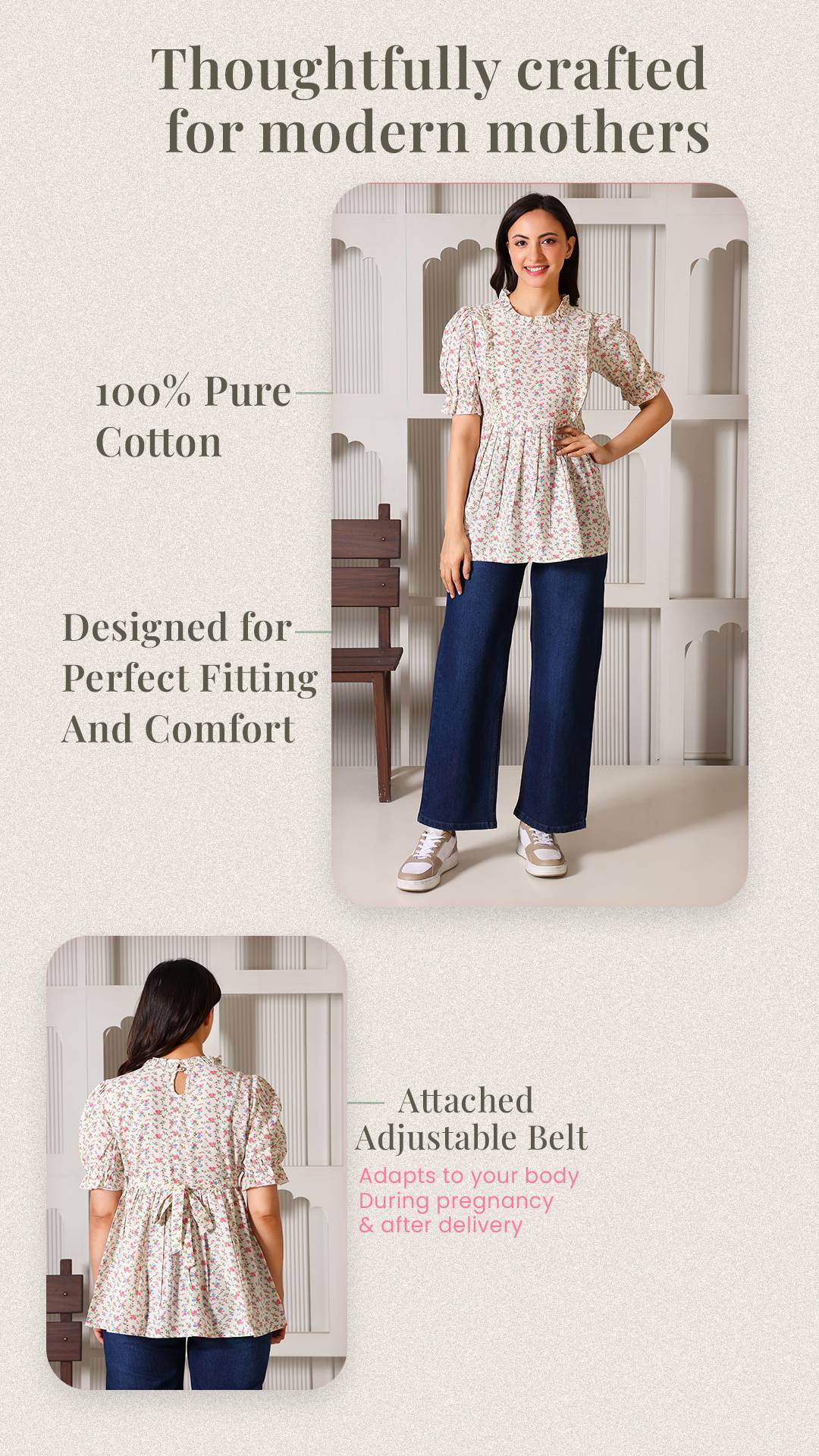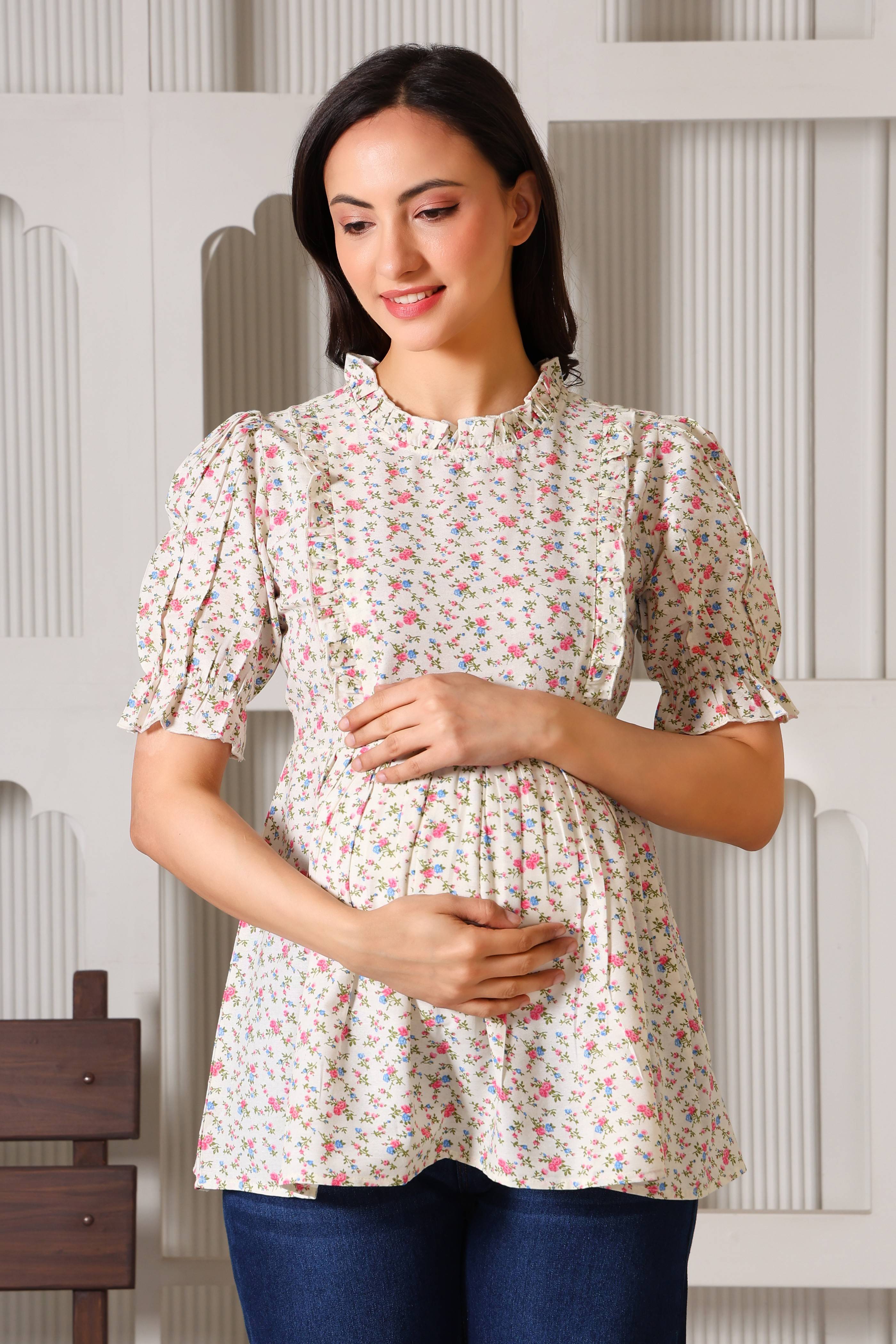 Celebrate motherhood in style with a top designed to evolve with you. Crafted from soft and skin friendly breathable fabrics, this charming floral peplum top transitions seamlessly from pregnancy to postpartum. It features discreet, hidden zippers tucked under elegant ruffles for effortless nursing access, while the adjustable back belt ensures a perfect fit at every stage. Breathable, functional, and undeniably chic, it’s the ultimate wardrobe staple for the modern mom.