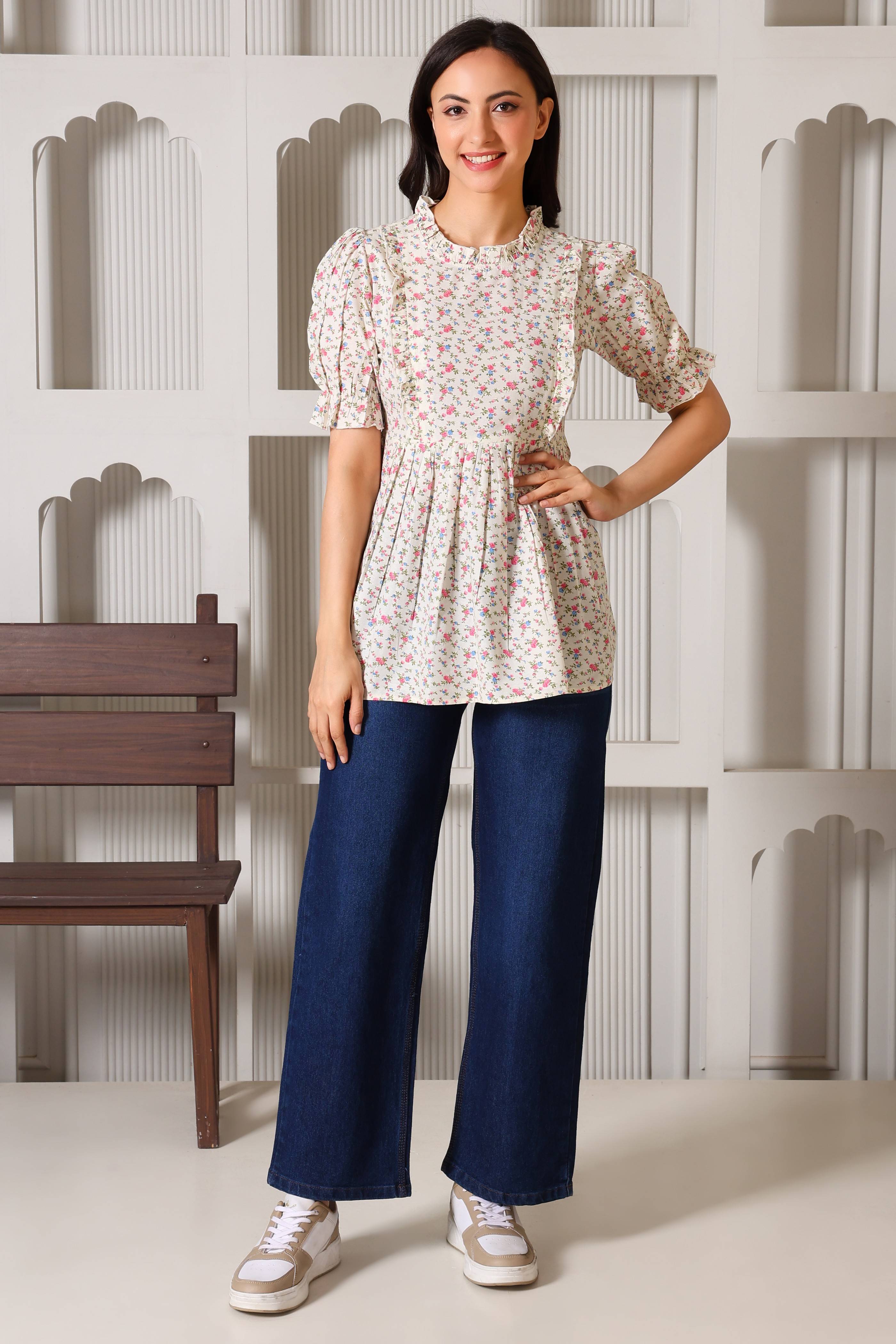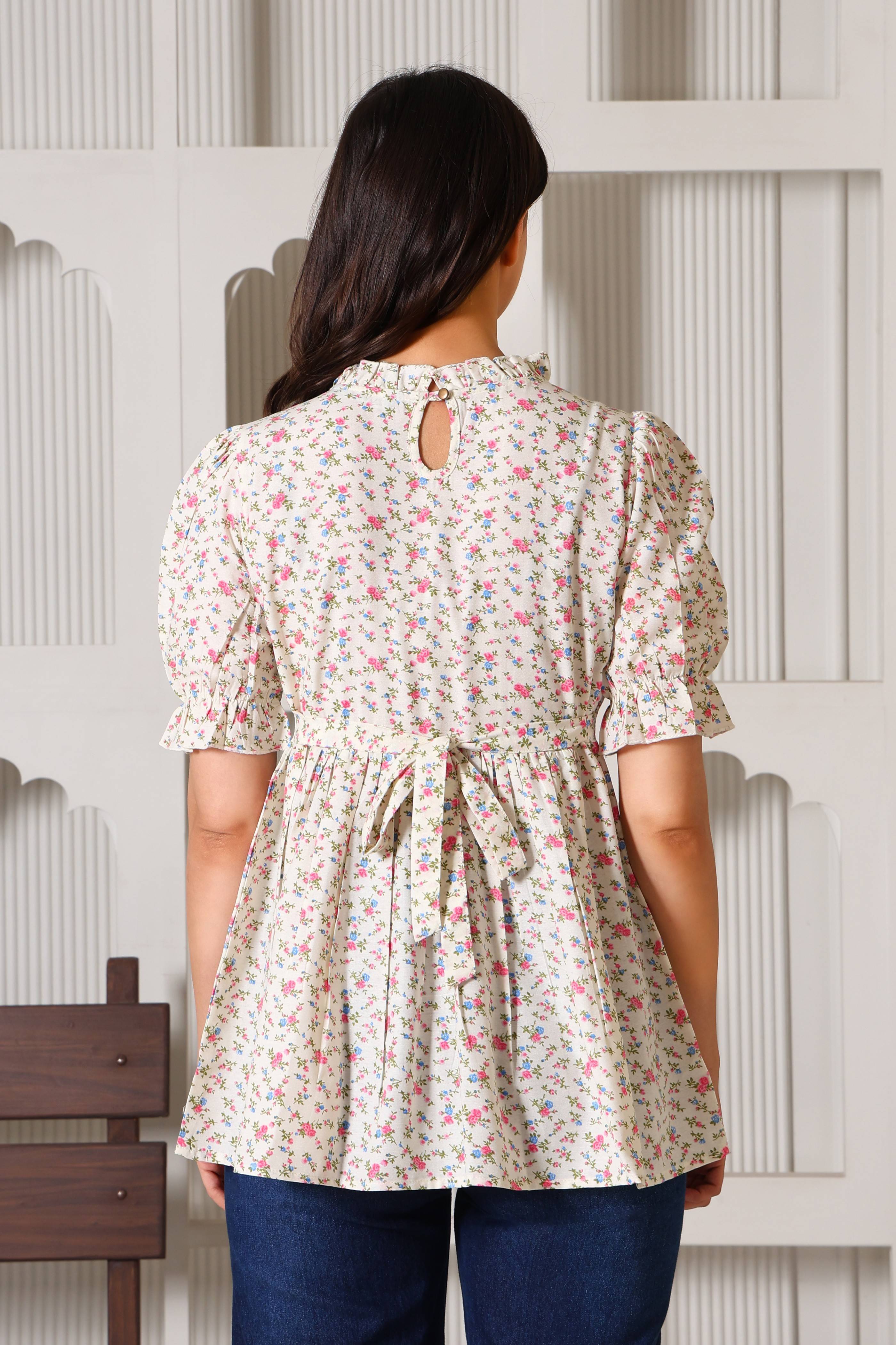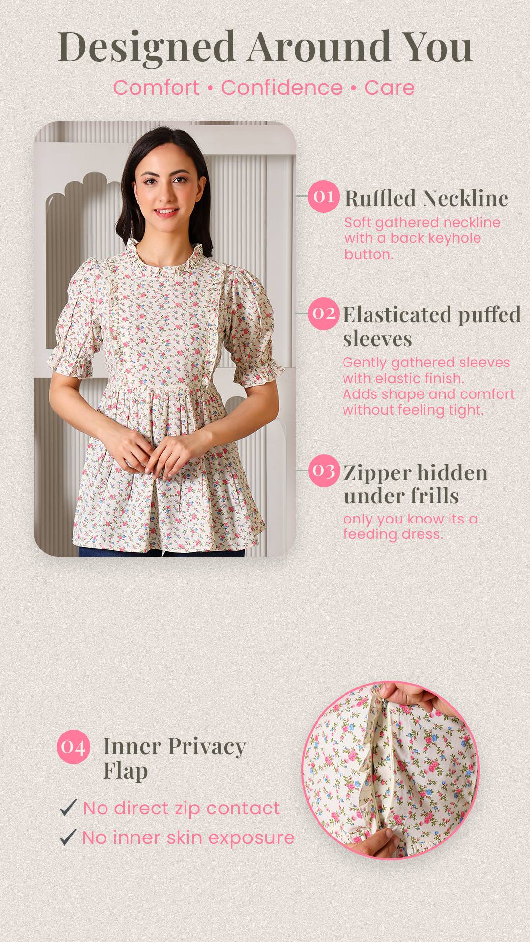 Celebrate motherhood in style with a top designed to evolve with you. Crafted from soft and skin friendly breathable fabrics, this charming floral peplum top transitions seamlessly from pregnancy to postpartum. It features discreet, hidden zippers tucked under elegant ruffles for effortless nursing access, while the adjustable back belt ensures a perfect fit at every stage. Breathable, functional, and undeniably chic, it’s the ultimate wardrobe staple for the modern mom.