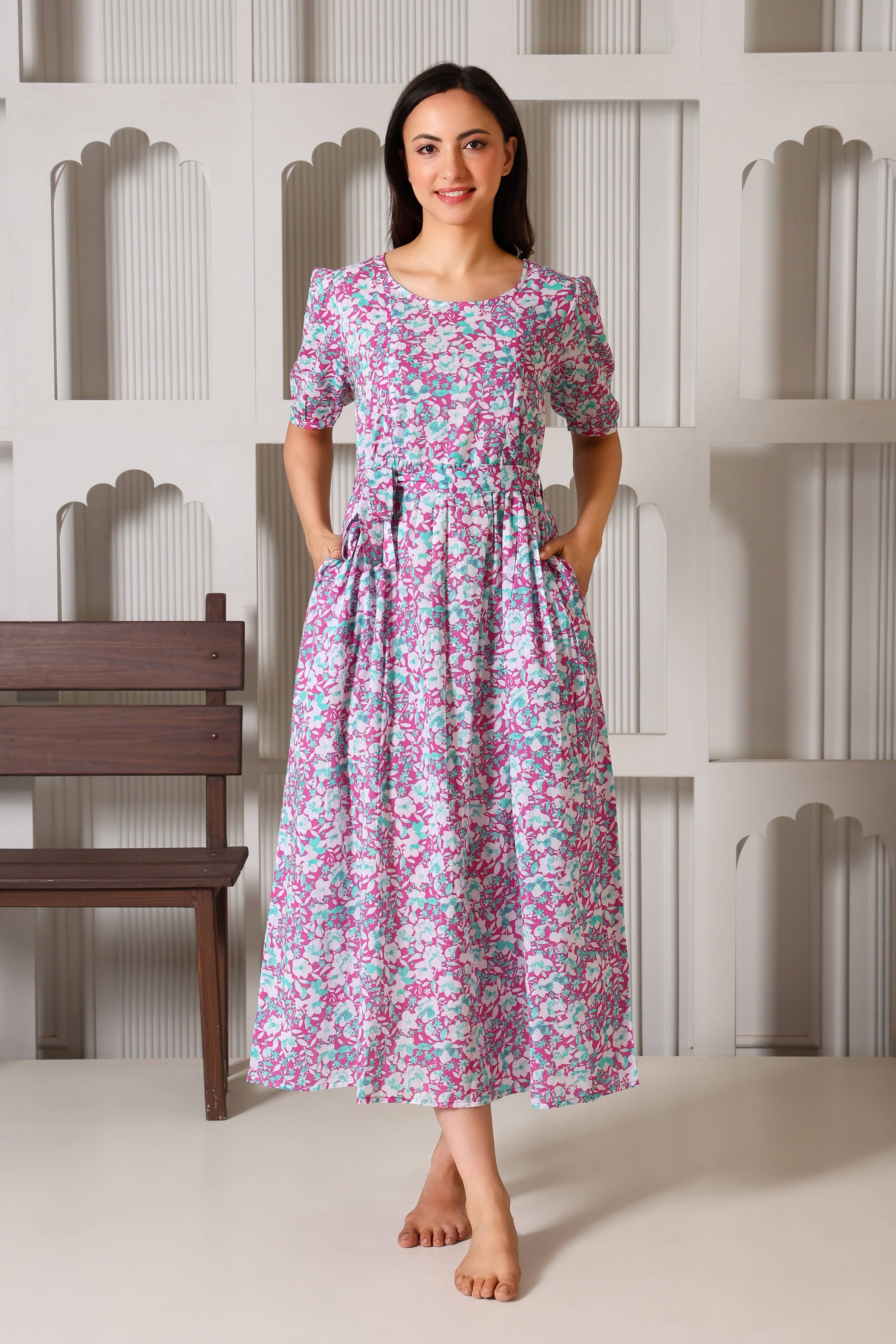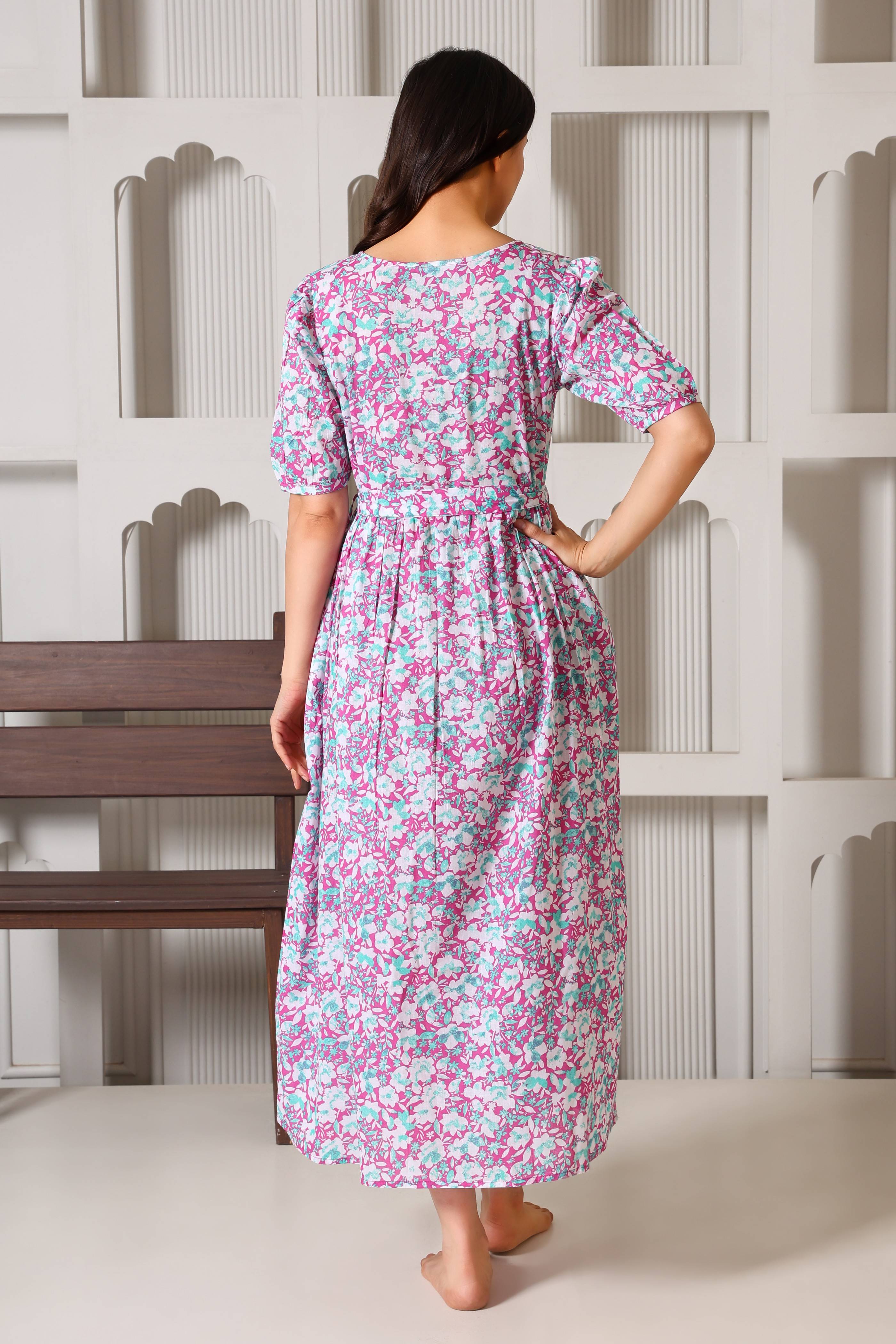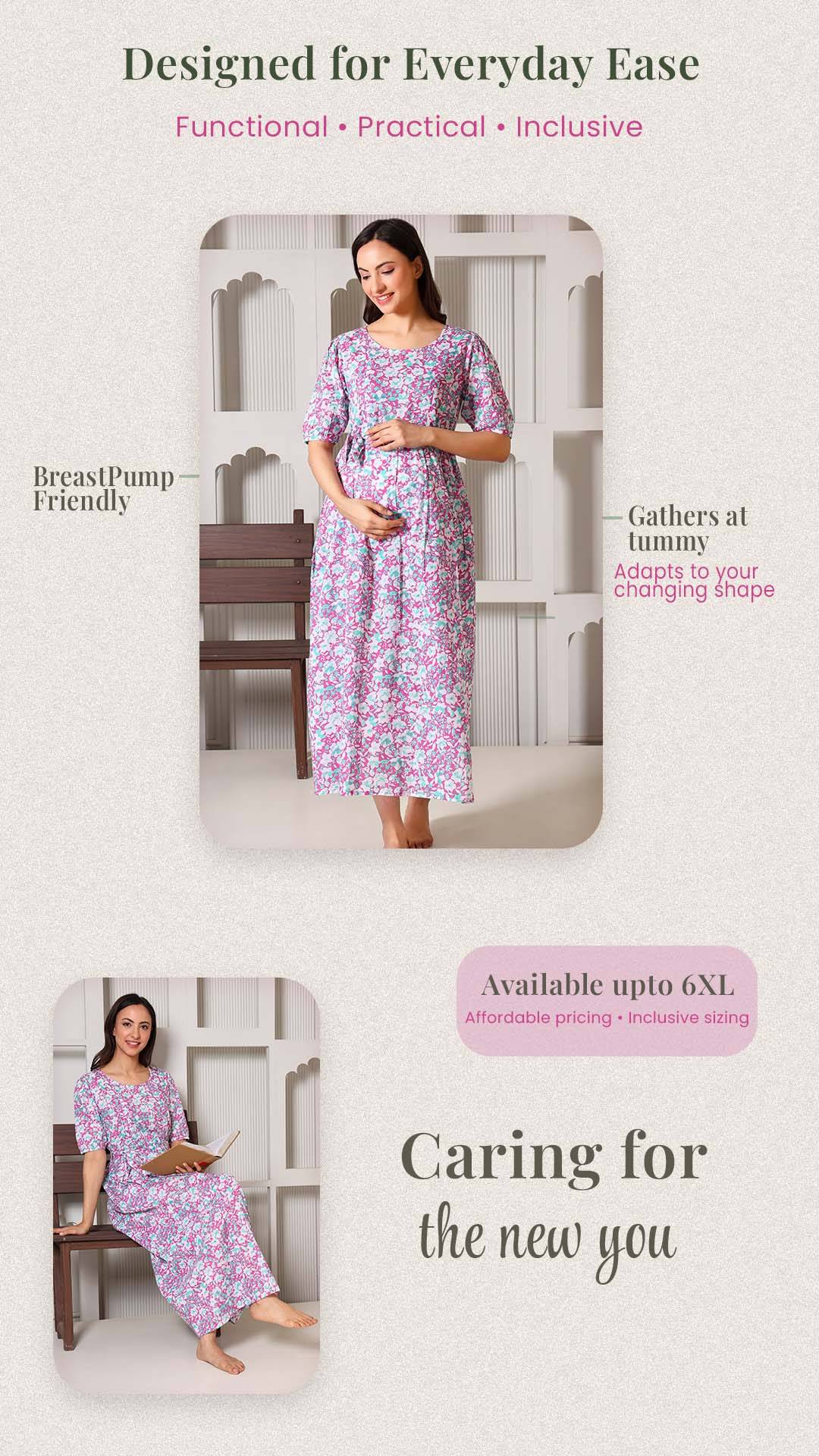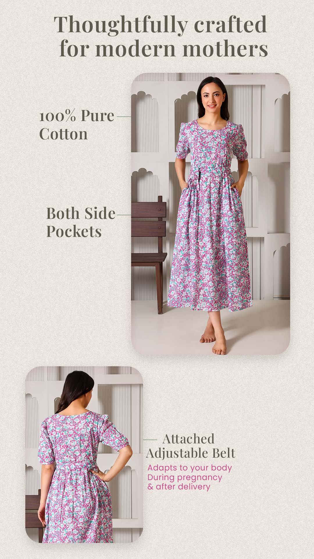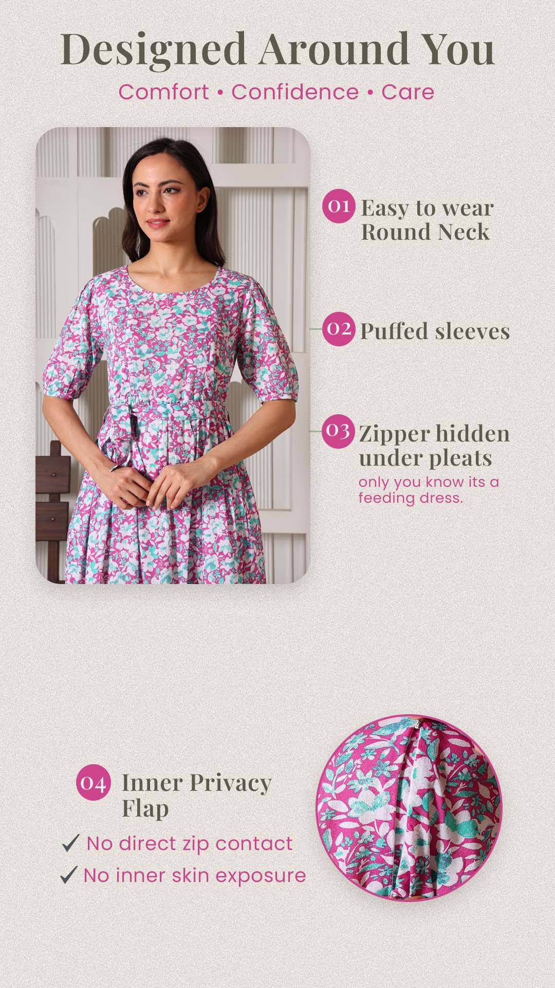 Crafted from 100% premium cotton, this dress is the perfect blend of feminine charm and functional design. We’ve replaced bulky "maternity wear" with a tailored silhouette that features hidden dual-sided zippers and privacy flaps, ensuring your nursing journey is as comfortable as it is stylish. From the elegant puff sleeves to the versatile waist-tie, it’s designed to be your go-to outfit throughout pregnancy and well into motherhood.
