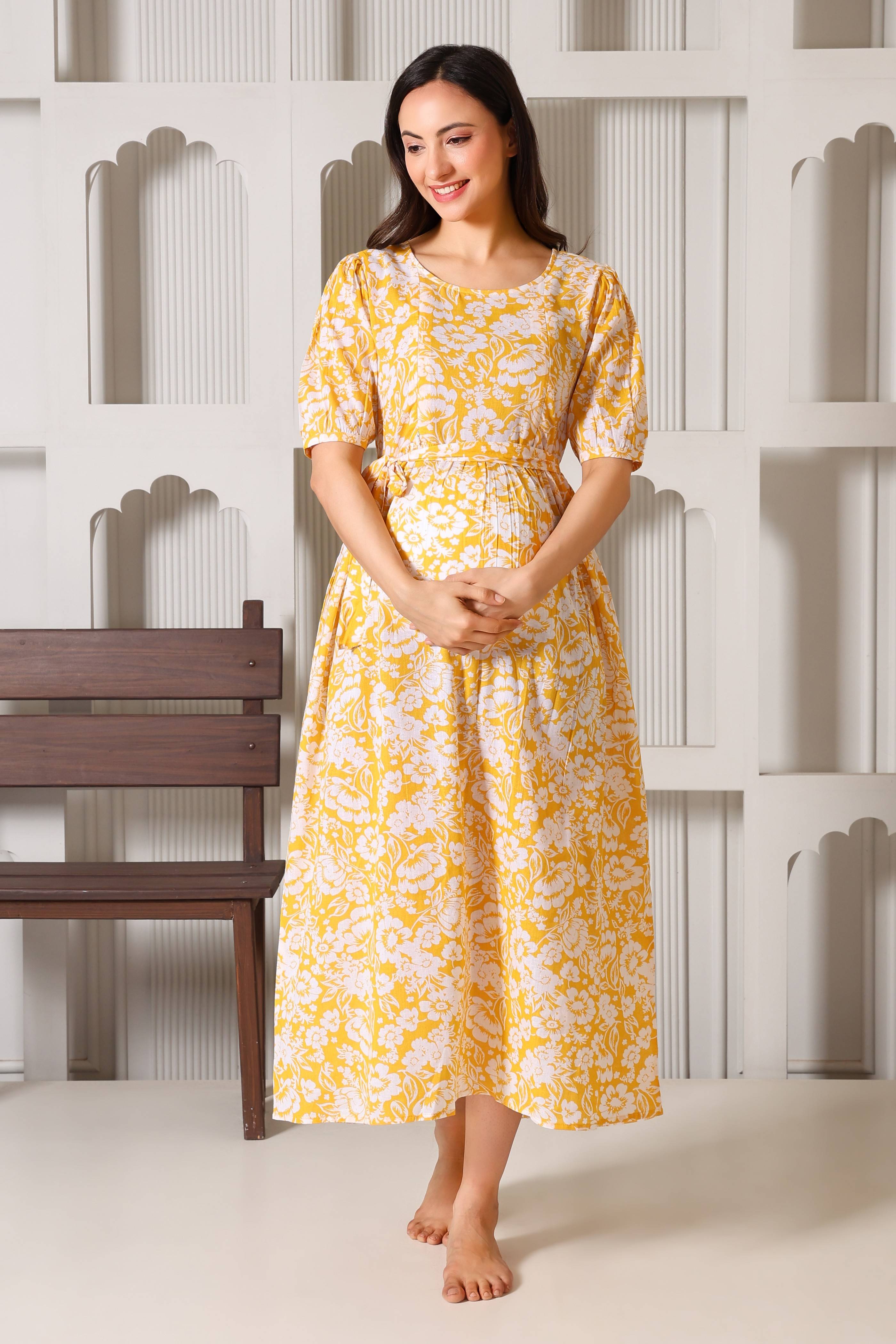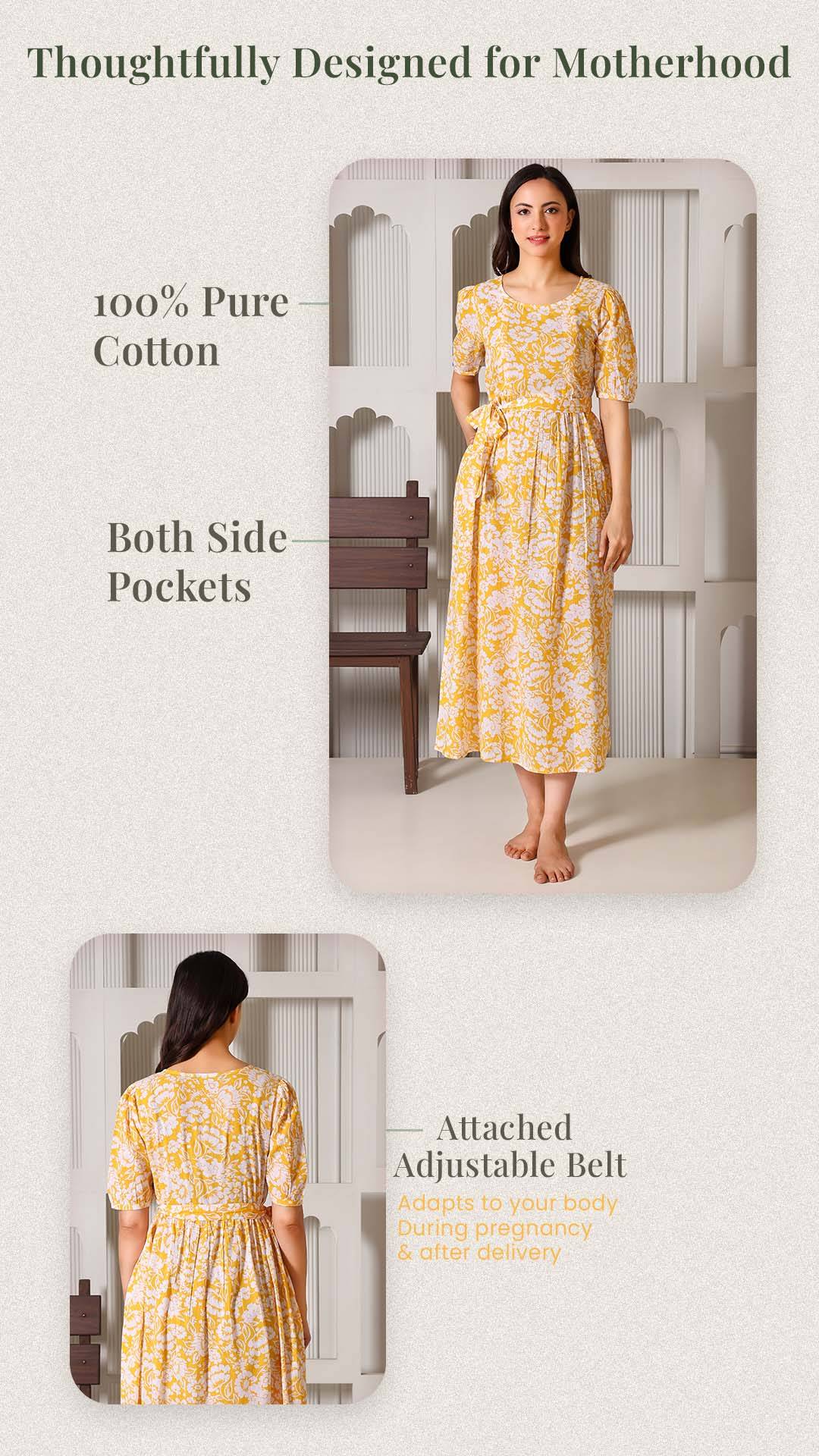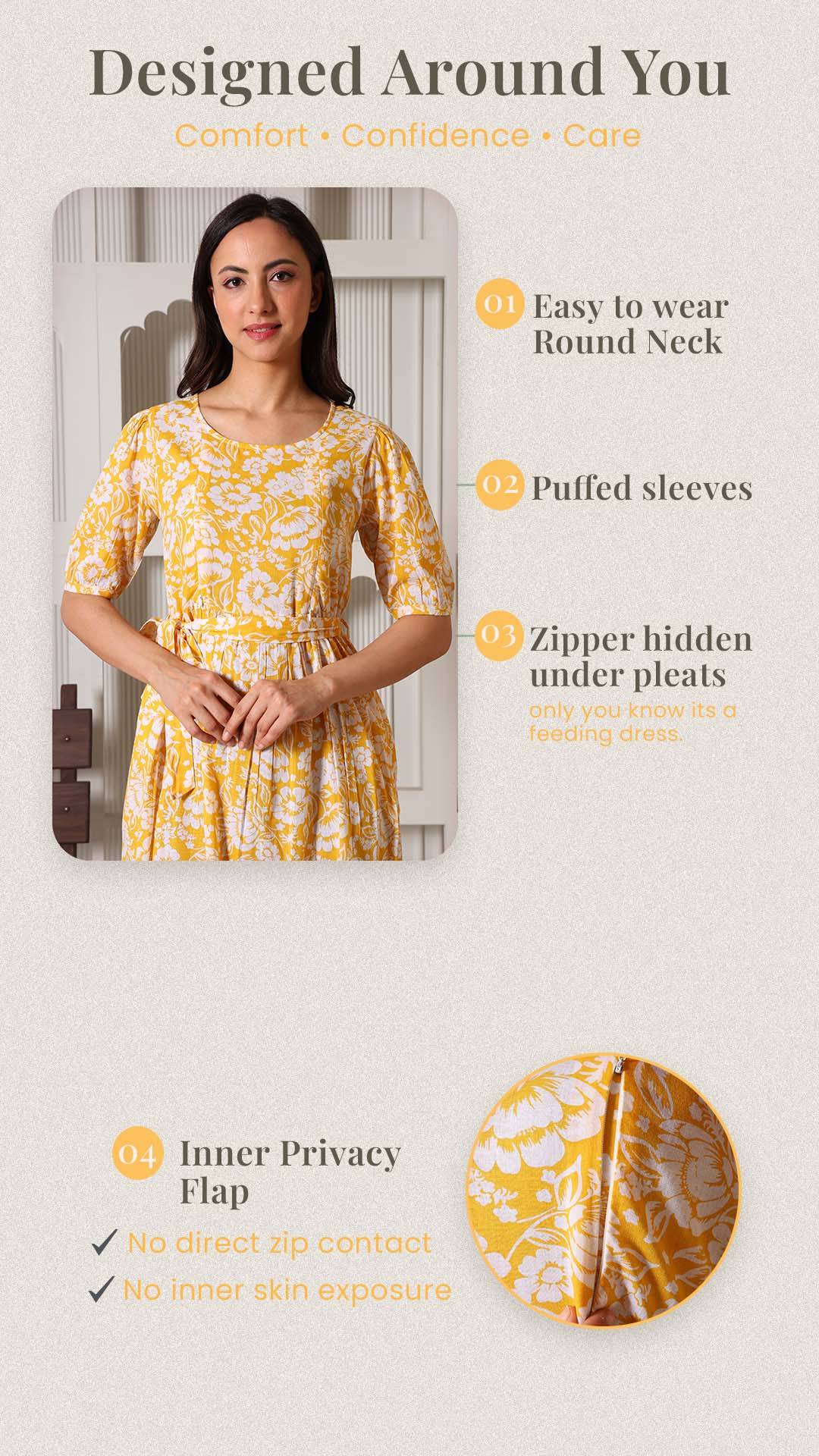 Crafted from 100% premium cotton, this dress is the perfect blend of feminine charm and functional design. We’ve replaced bulky "maternity wear" with a tailored silhouette that features hidden dual-sided zippers and privacy flaps, ensuring your nursing journey is as comfortable as it is stylish. From the elegant puff sleeves to the versatile waist-tie, it’s designed to be your go-to outfit throughout pregnancy and well into motherhood.